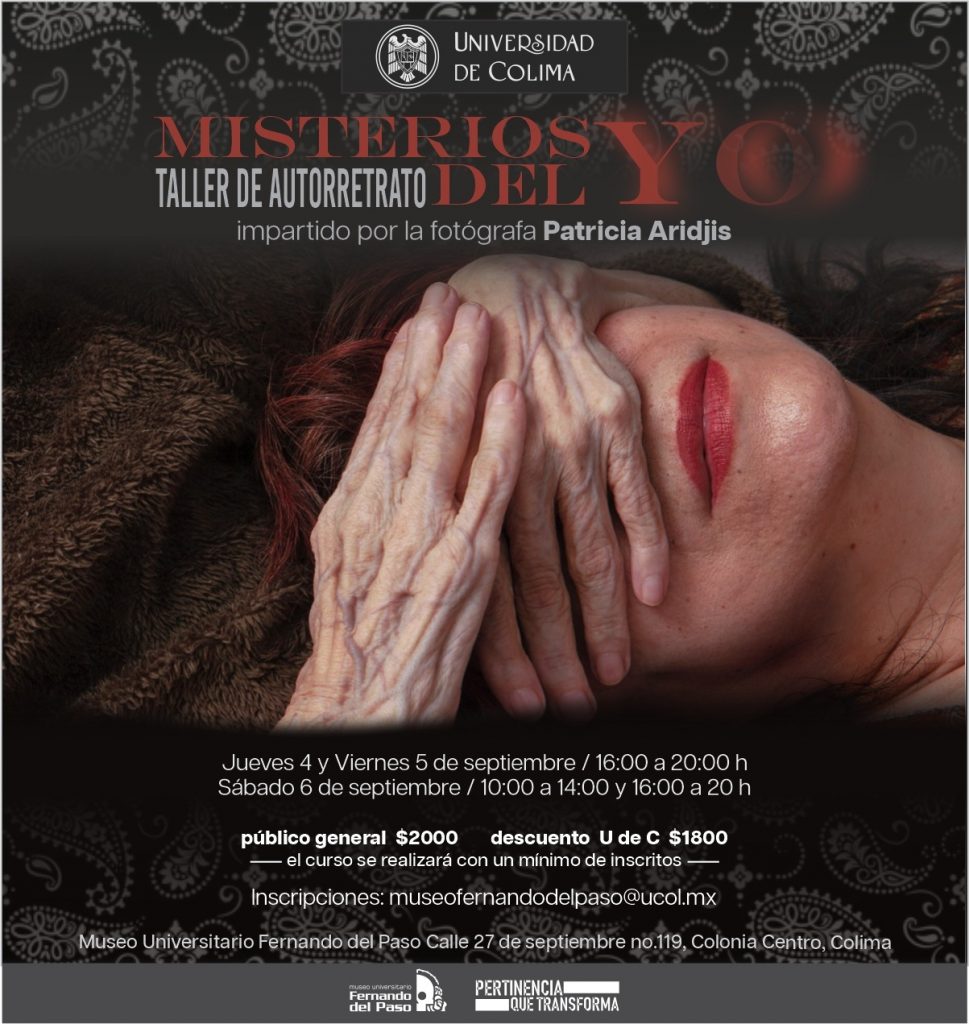 El Museo Universitario “Fernando del Paso” invita a participar en el taller de autorretrato “Misterios del yo”, que será impartido por la reconocida fotógrafa Patricia Aridjis como actividad de cierre de su exitosa exposición “Mujeres de peso”, la cual se exhibe en este espacio desde mayo pasado.