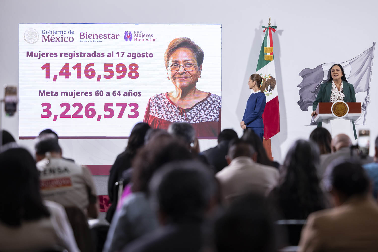 En la conferencia matutina de este lunes en Palacio Nacional, publica el diario El Universal, Montiel Reyes indicó que la meta para registrar este agosto es de 2 millones 224 mil mujeres de 60, 61 y 62 años. Al 17 de agosto van un millón 416 mil registros.