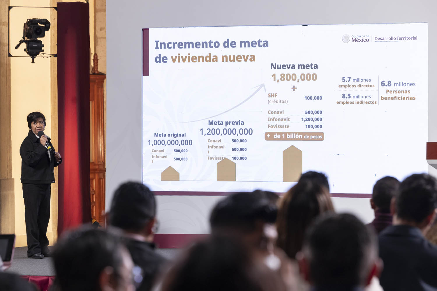 En el Salón Tesorería, la titular de Sedatu recordó que la meta era construir un millón de viviendas en el sexenio, pero “se hizo un esfuerzo” y la nueva meta es de un millón 800 mil.
