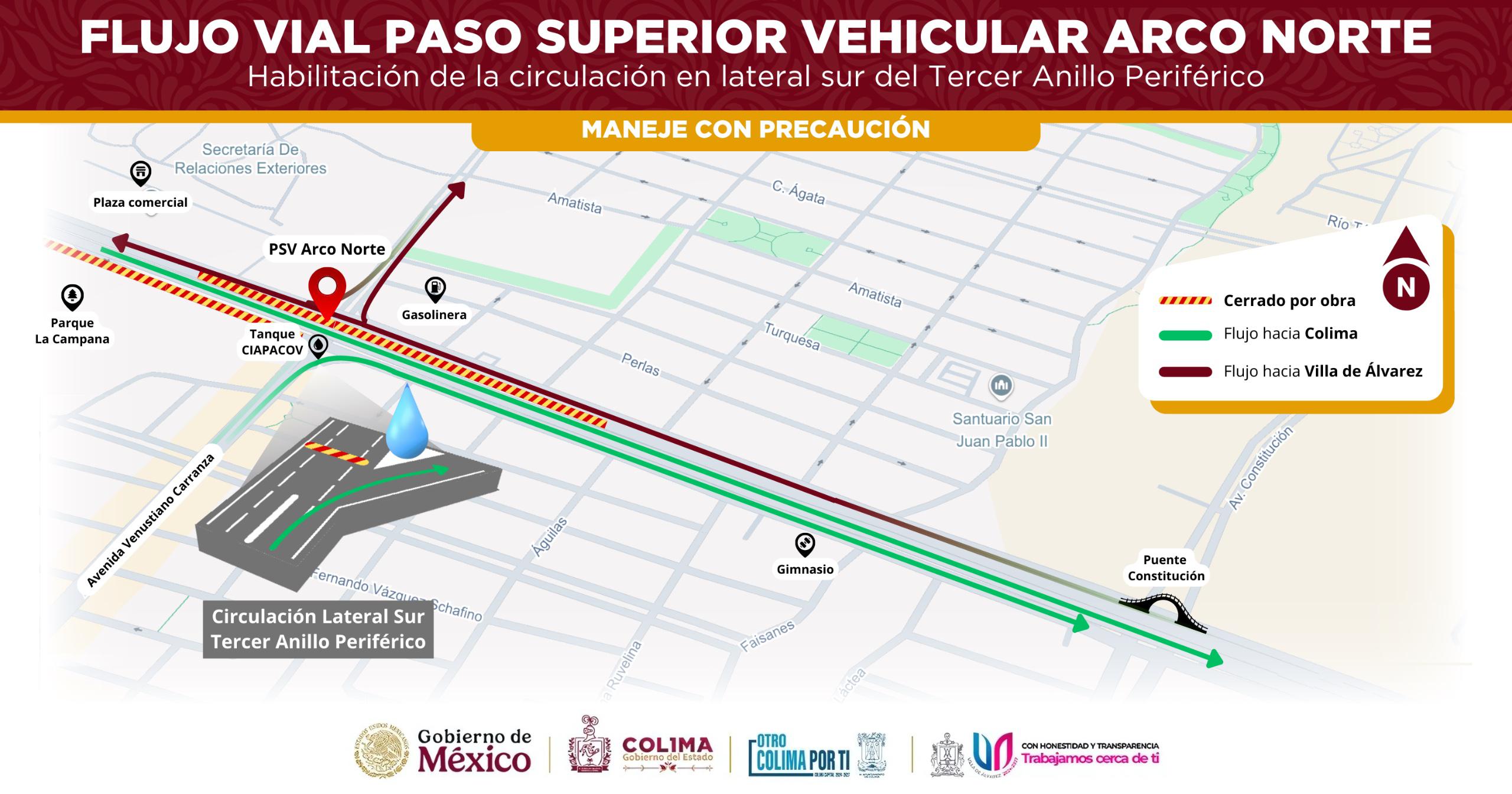 Este miércoles (20) quedó habilitada la circulación en la lateral sur del Tercer Anillo Periférico, en sentido Villa de Álvarez a Colima, a la altura del tanque de Ciapacov, dio a conocer el Gobierno del estado.