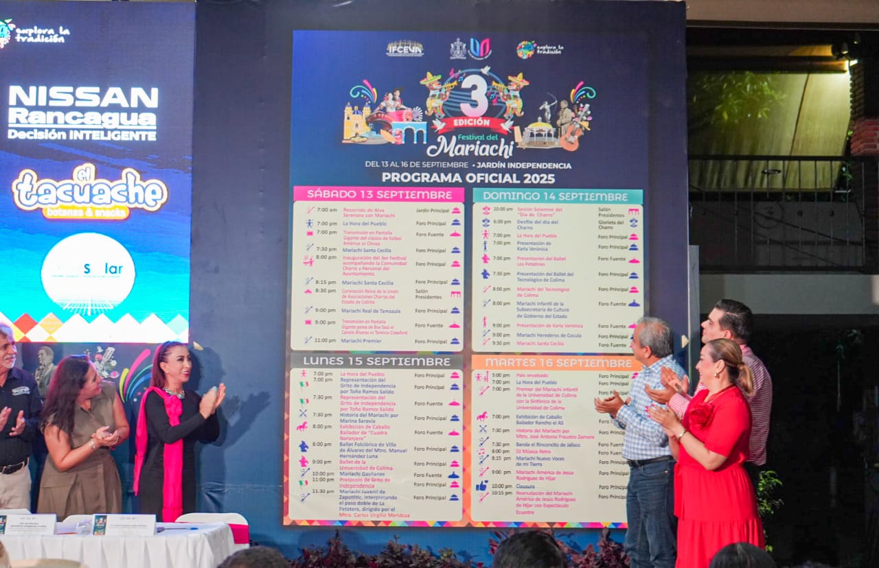 En la presentación de actividades del Tercer Festival del Mariachi Villa de Álvarez 2025, la presidenta Tey Gutiérrez anunció que en el evento a desarrollarse en el jardín principal del 13 al 16 de septiembre habrá mariachis, bandas, cantantes, una orquesta sinfónica, danza folclórica, espectáculo ecuestre, fuegos artificiales, degustaciones de mezcal y tequila y venta de antojitos mexicanos.