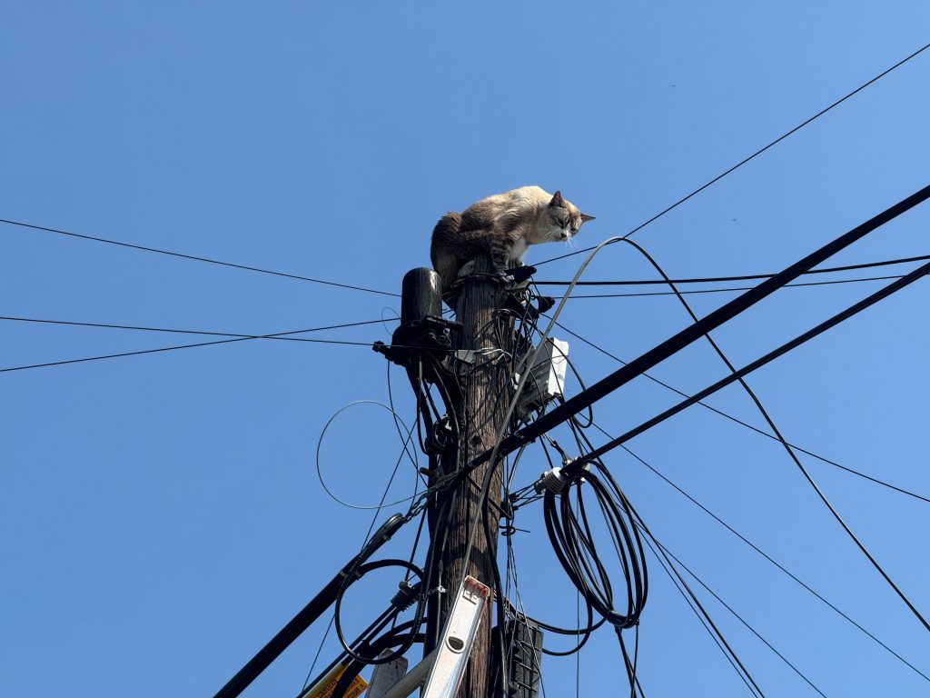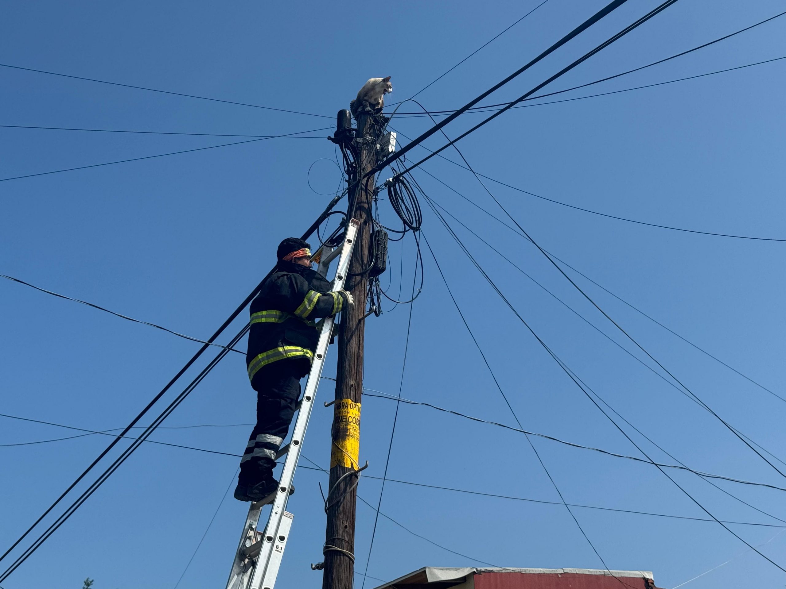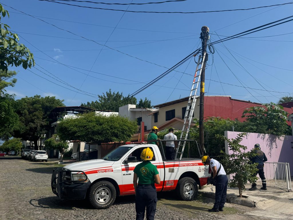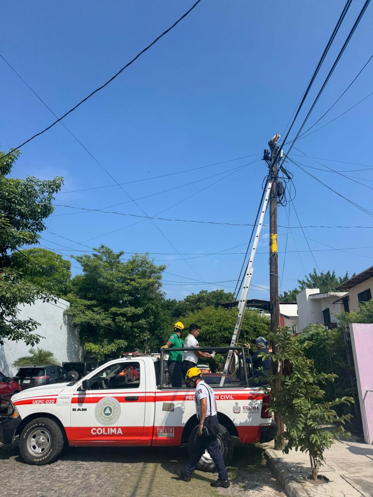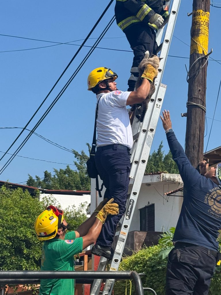Elementos de la Unidad Municipal de Protección Civil del Ayuntamiento de Colima rescataron a un gato que permanecía atrapado en la parte superior de un poste de alumbrado público en la colonia Lomas de Circunvalación, tras el reporte realizado por vecinos de la zona.