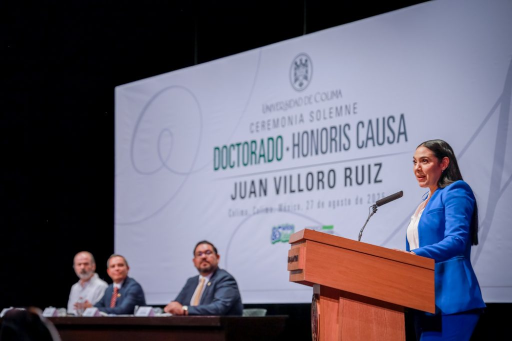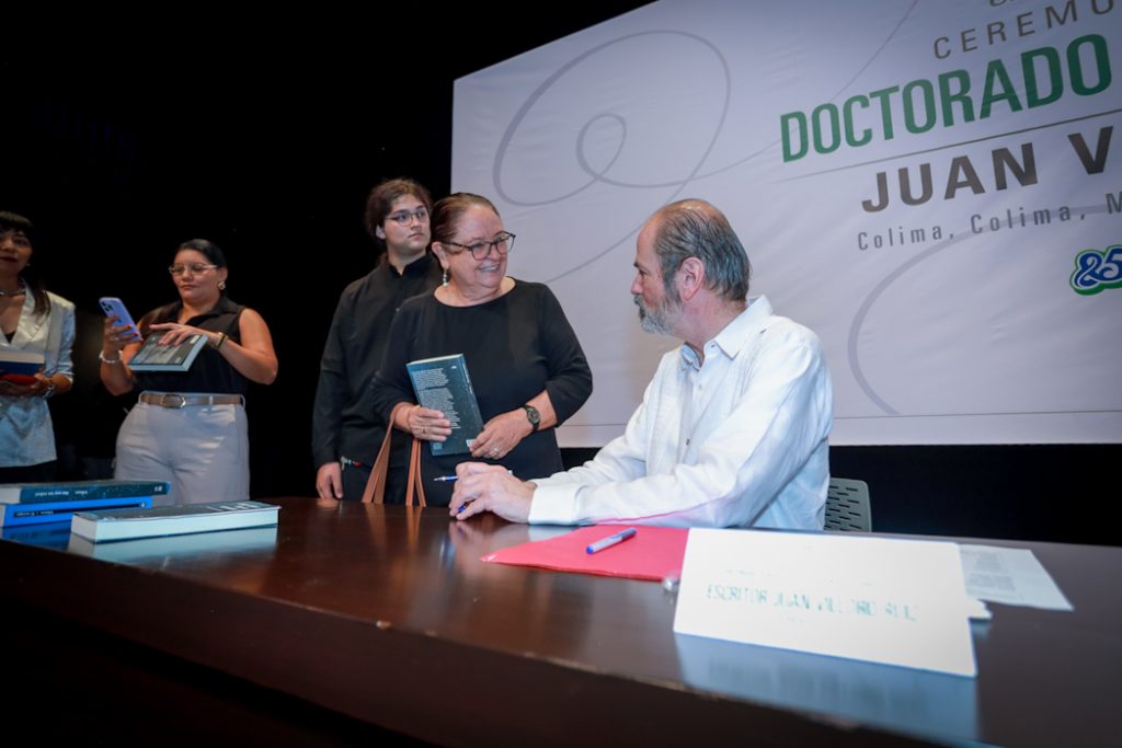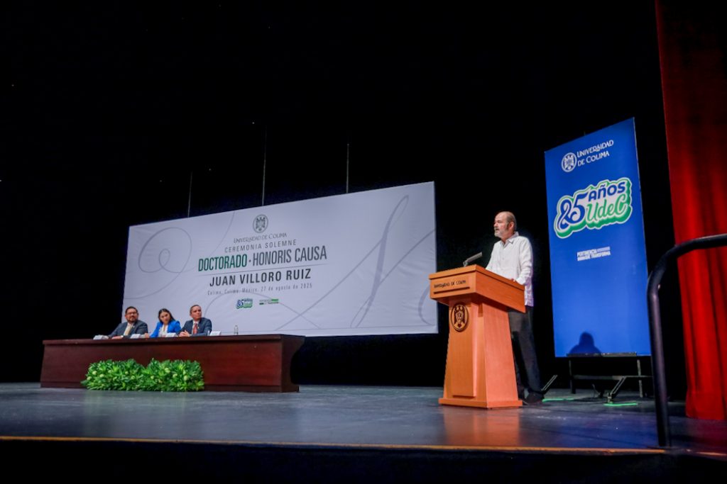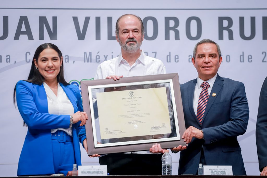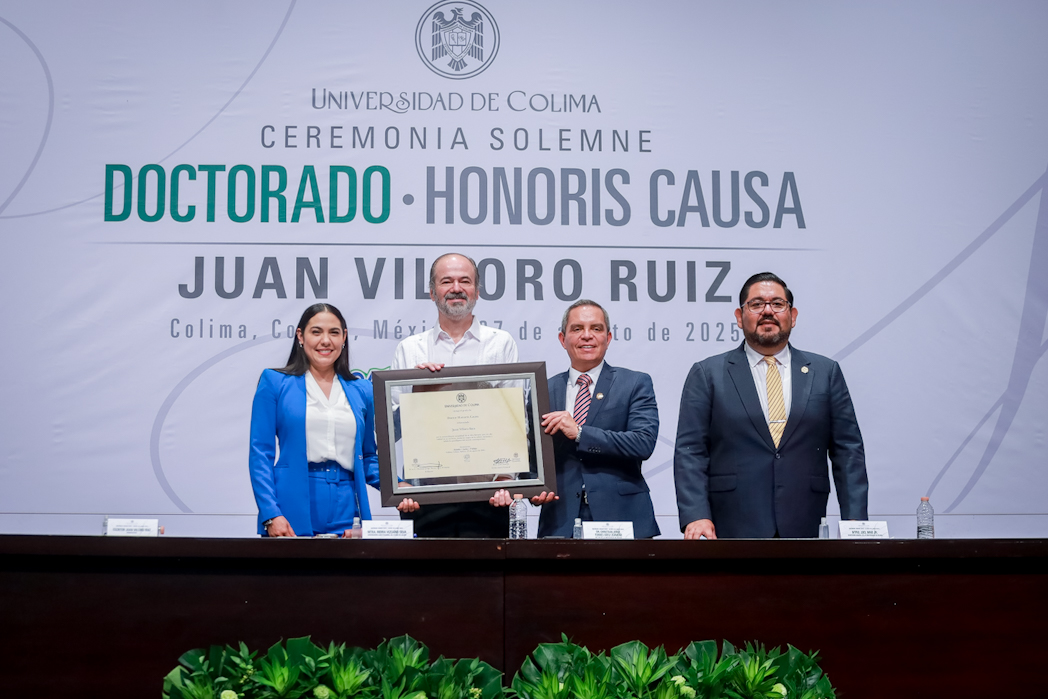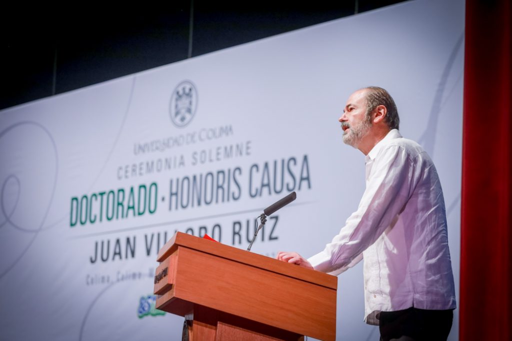 Christian Jorge Torres Ortiz Zermeño, Rector de la Universidad de Colima, entregó en nombre de la comunidad universitaria, el grado de Doctor Honoris Causa a Juan Villoro Ruiz, destacado escritor, cronista, ensayista y periodista mexicano, por la extraordinaria versatilidad de su obra literaria, que, dice el Acuerdo, “con alta calidad en su escritura, revela los rasgos de la cultura mexicana y señala los paradigmas del mundo contemporáneo”.