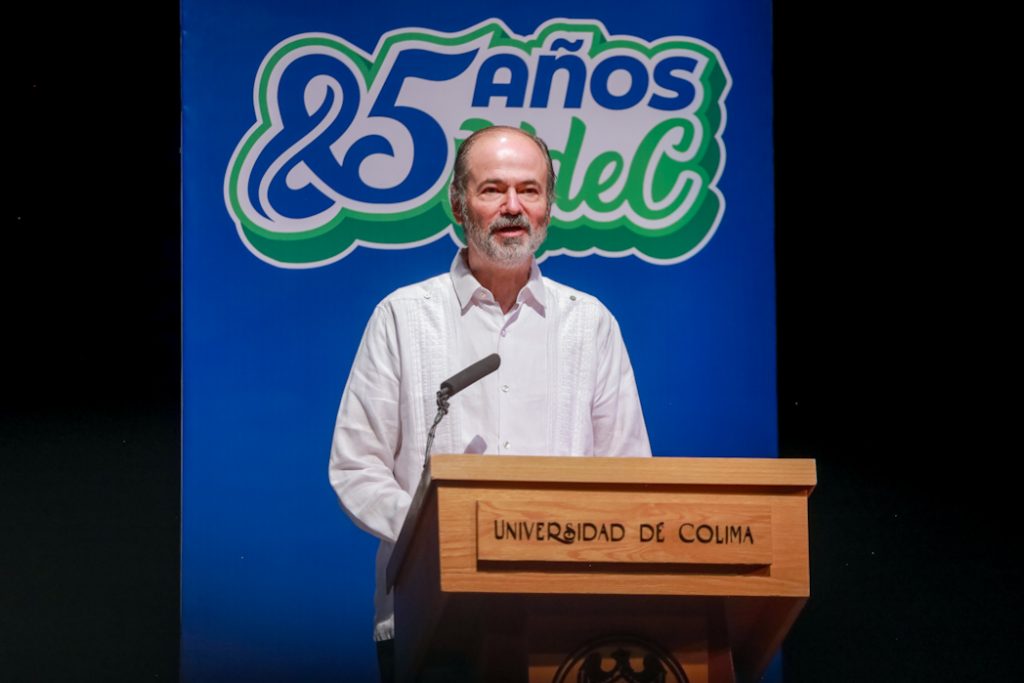 En su mensaje, el Rector resaltó que, desde su origen, la Universidad de Colima ha sido un espacio para la enseñanza, la investigación y la difusión de la cultura. “Este acto tiene un significado especial porque se realiza, precisamente, en el marco del 85 aniversario de nuestra institución, fecha que nos permite mirar con gratitud nuestro pasado y, al mismo tiempo, proyectar con responsabilidad nuestro porvenir”.