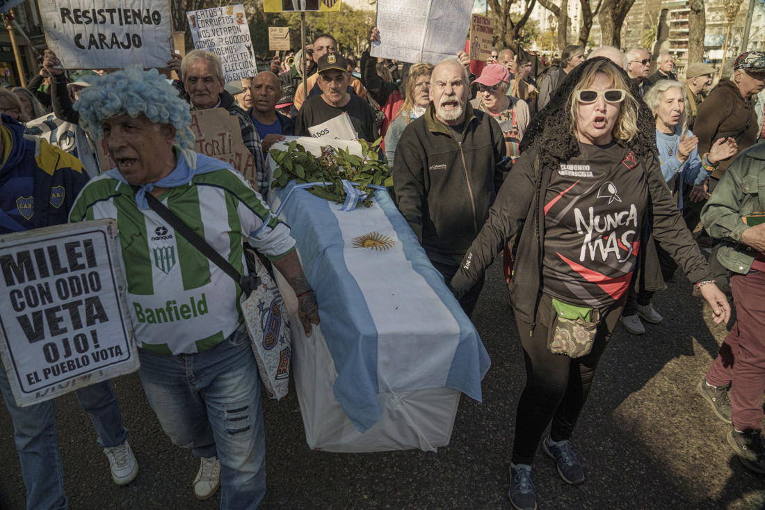 La concentración, integrada por grupos de izquierda y organizaciones sociales, incluyó una demostración en la que jubilados sostuvieron y transportaron en plena calle un ataúd con una bandera argentina encima que simulaba el “entierro” de las pensiones, en referencia a la negativa de la gestión de ultraderecha a subir los ingresos del sector.