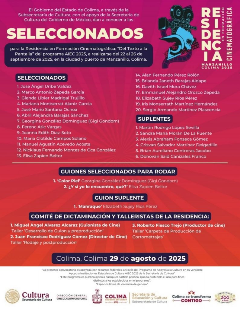 La Subsecretaría de Cultura del Gobierno del estado de Colima, en coordinación con la Secretaría de Cultura del Gobierno de México, a través del programa federal de Apoyos a Instituciones Estatales de Cultura, publicaron la lista de personas seleccionadas para integrar la Residencia en Formación Cinematográfica Manzanillo 2025, que se llevará a cabo del 22 al 26 de septiembre próximo.