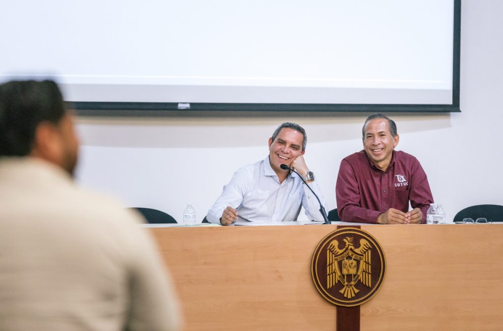 En un ambiente de diálogo respetuoso y unidad institucional, se llevó a cabo un encuentro entre el Rector de la Universidad de Colima, doctor Christian Jorge Torres Ortiz Zermeño, y el Comité Ejecutivo Central del Sindicato Único de Trabajadores de la UdeC (Sutuc), encabezado por su secretario general, Luis Enrique Zamorano Manríquez. La reunión se realizó en el auditorio de la Facultad de Ciencias Políticas y Sociales del Campus Norte.
