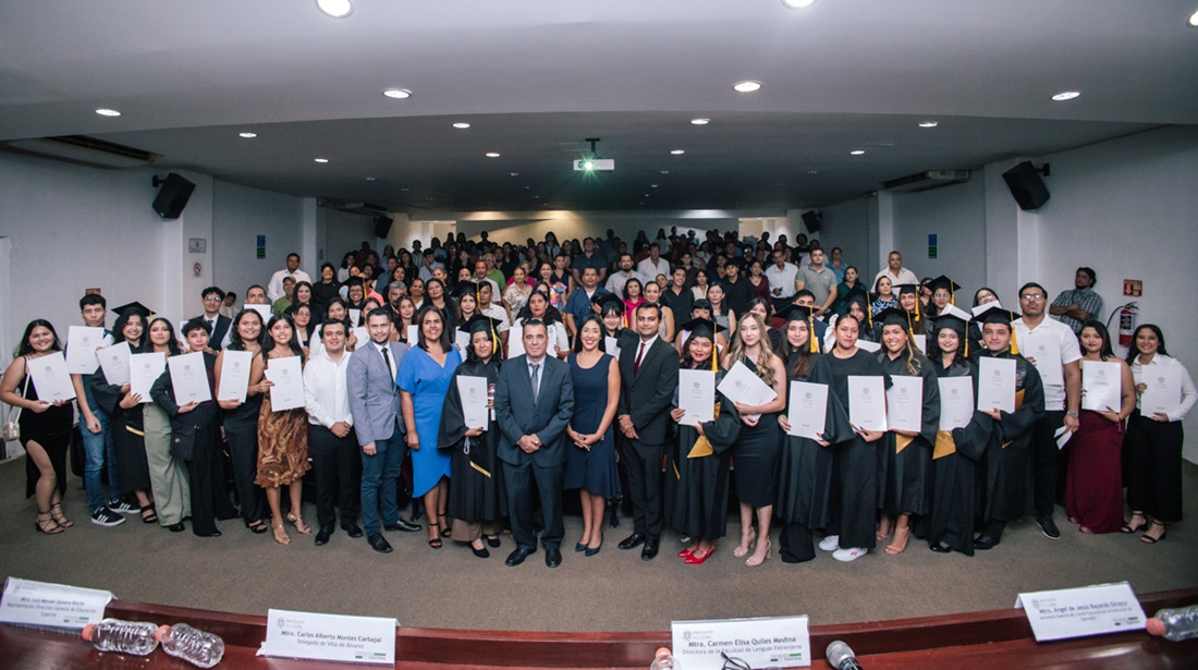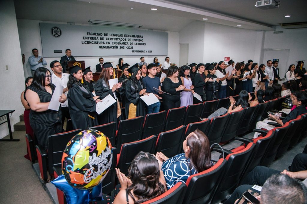 Cumpliendo con una de sus funciones sustantivas, la Universidad de Colima (UdeC) entregó su certificado de estudios a 69 egresados de la Licenciatura en Enseñanza de Lenguas, en un emotivo acto donde los jóvenes estuvieron acompañados por familiares, docentes y directivos de la Facultad de Lenguas Extranjeras (FLEX). Este evento se llevó a cabo en el auditorio de la Facultad de Ciencias de la Educación del Campus Central.