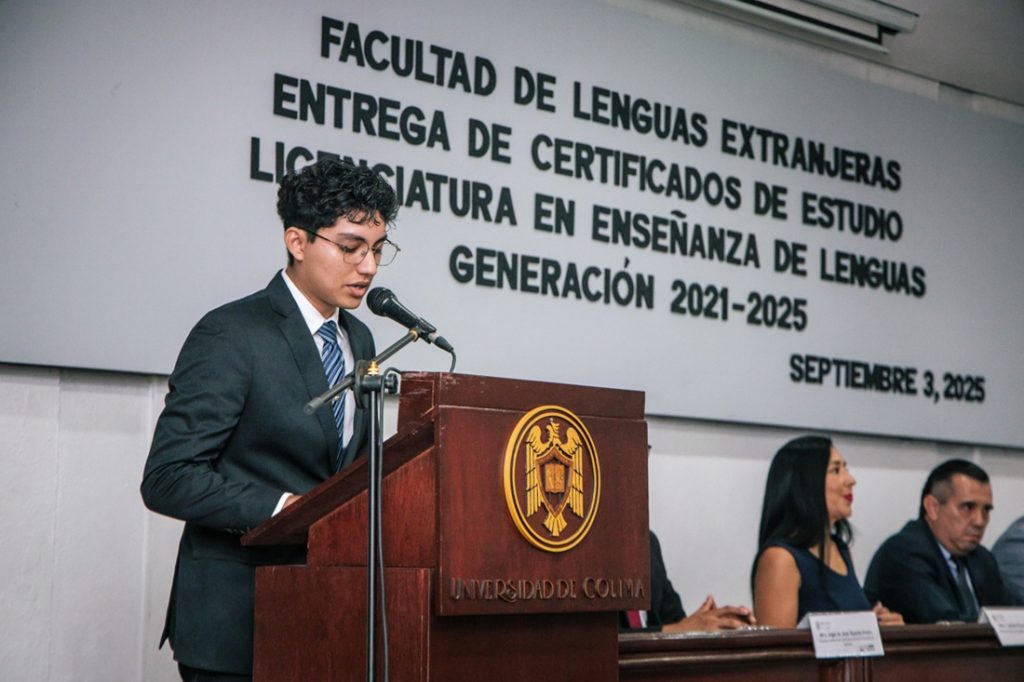 Por su parte, la directora de la FLEX, Elisa Quiles Medina, dijo en su mensaje que, con el egreso de esta nueva generación de licenciados en Enseñanza de Lenguas, la UdeC cumple con la función sustantiva de ofrecer a los jóvenes colimenses educación como una vía de transformación personal y social. “Ustedes forman parte de una generación que eligió el camino de la enseñanza, un campo que exige no solo conocimiento, sino también compromiso, ética y sensibilidad hacia los demás”.