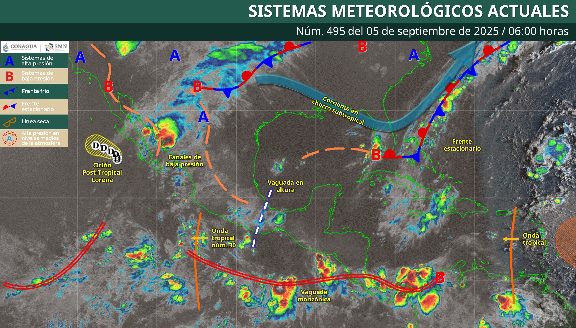 El Servicio Meteorológico Nacional (SMN) informó que para este viernes 5 de septiembre se prevén lluvias puntuales fuertes en Colima, derivadas de los desprendimientos nubosos del ciclón tropical Lorena y de la interacción con la onda tropical número 30 y el monzón mexicano.