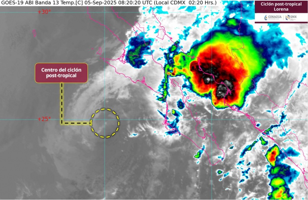 La tormenta Lorena, debilitada a ciclón post-tropical, se ubica este viernes frente a la costa occidental de Baja California Sur, y continuará provocando fuertes lluvias en el noroeste y norte de México, informó el Servicio Meteorológico Nacional (SMN).