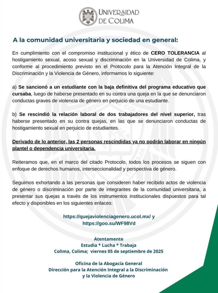 La Máxima Casa de Estudios del estado precisa que lo anterior se da en “cumpliendo con el compromiso institucional y ético de cero tolerancia al hostigamiento sexual, acoso sexual y discriminación en la Universidad de Colima y conforme al procedimiento previsto en el Protocolo para la Atención Integral de la Violencia de Género”.