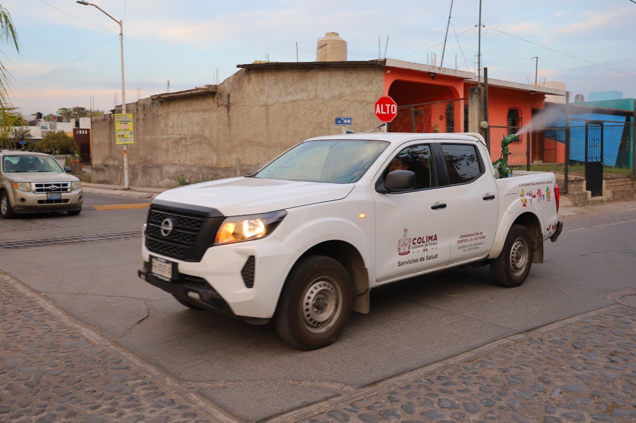 La dependencia estatal indicó en un comunicado de prensa, que con unidades pesadas se fumiga este lunes en la colonia San Pablo (Colima), colonias Sor Juana Inés de la Cruz, Santa Elena y fraccionamiento Limonero (Tecomán) y colonias Cuauhtémoc y Constitución (Manzanillo).