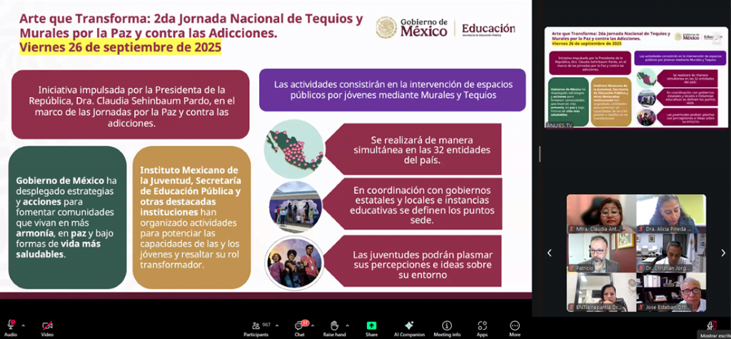 Para ampliar la información sobre la convocatoria Murales por la Paz y contra las Adicciones, Abraham Carro Toledo, director general del Instituto Mexicano de la Juventud, resaltó que, derivado del éxito de la primera Jornada de Tequios a nivel nacional, se llevará a cabo este próximo viernes 26 de septiembre una segunda jornada en las 32 entidades del país. “Con la participación y el apoyo de todos, se busca lograr el objetivo de cubrir por lo menos mil murales en todo el país, esto con el fin de que se siga hablando de la campaña por la paz y en contra de las adicciones”.