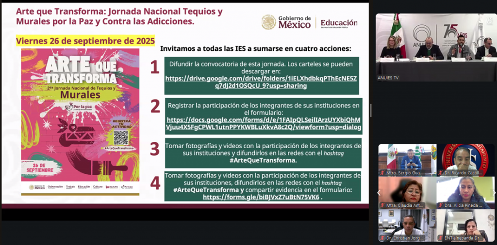 Entre otros temas desarrollados, fue presentada la convocatoria para la Segunda Jornada Nacional de Tequios y Murales por la Paz y contra las Adicciones, que se llevará a cabo el 26 de septiembre en las 32 entidades del país y en la que se espera la realización de más de mil de estos murales. En la primera jornada, que consistió en limpiar de basura lugares públicos del estado, la UdeC se sumó con estudiantes y trabajadores.