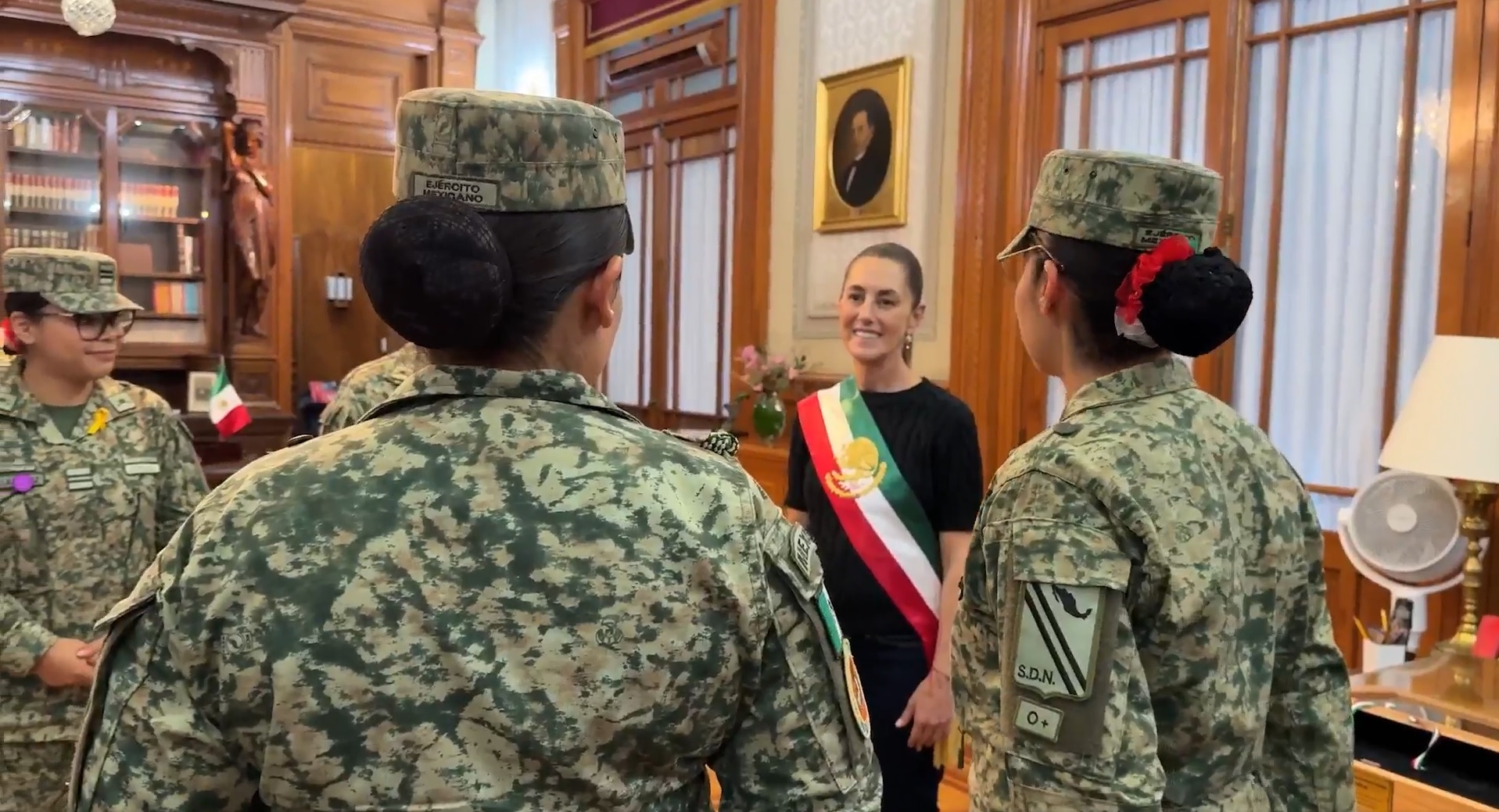 En las imágenes aparece Sheinbaum en Palacio Nacional mientras un grupo de mujeres militares le toman medidas.