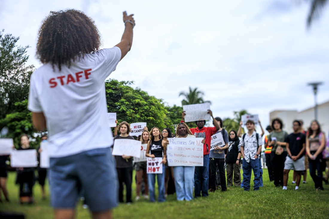 Estudiantes de la Universidad Internacional de Florida (FIU, en inglés) protestaron contra un acuerdo firmado por la institución que permitirá a la policía escolar interrogar a los estudiantes sobre su estatus migratorio y detenerlos si sospechan de que están ilegalmente en EUA.