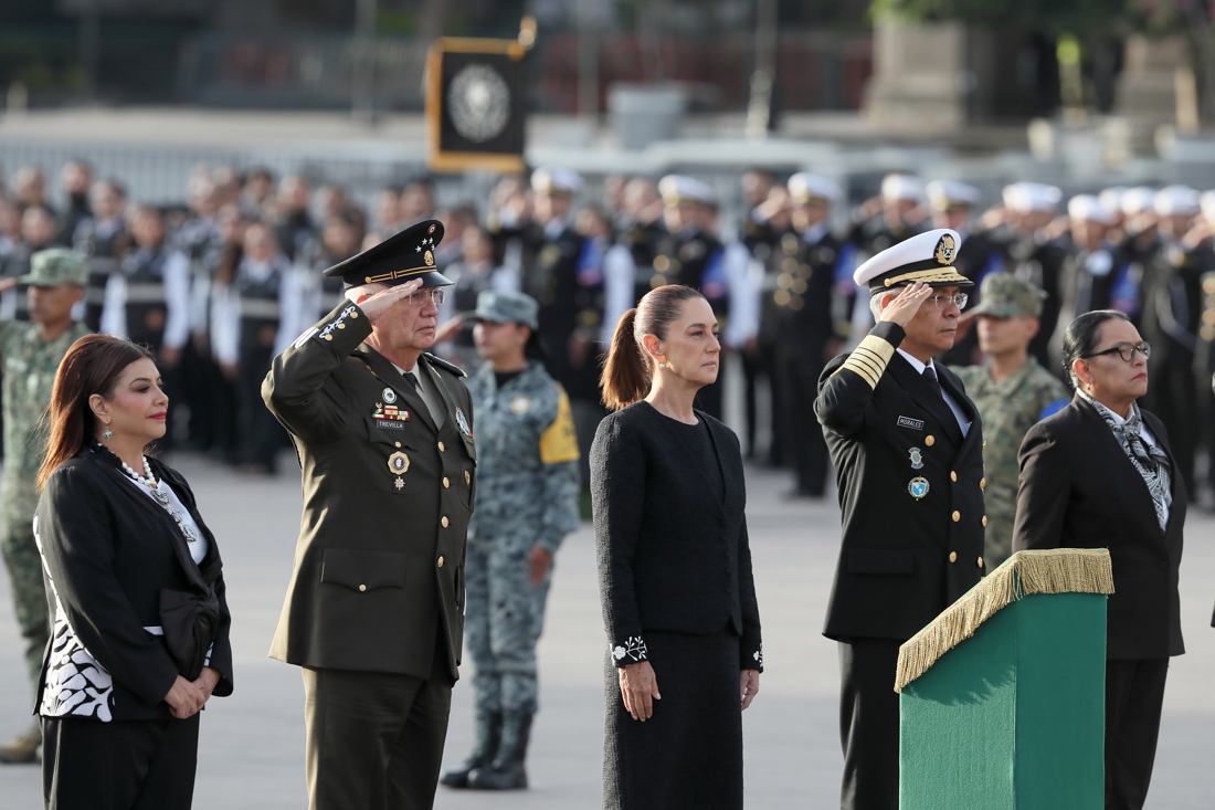 Rodeada de elementos del Ejército mexicano, de la Guardia Nacional funcionarios de su gabinete, de la jefa de Gobierno de la Ciudad de México, Clara Brugada, y directores de Protección Civil y de la Cruz Roja Mexicana, la mandataria izó la bandera a media asta para honrar a las decenas de miles de víctimas de ambos terremotos.