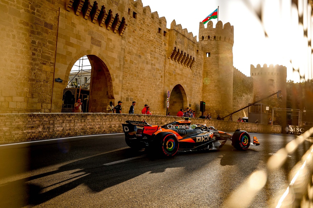 Tras un parón de 2 semanas, los autos de F1 regresaron al Circuito callejero de Bakú con clima nublado pero seco. Norris estableció un tiempo de 1:42.704s con neumáticos blandos, superando por 1 segundo a Verstappen y a su compañero de McLaren, Piastri. Mientras tanto, Hamilton rozó la pared en la curva 5 y regresó a boxes con daños en el alerón delantero.