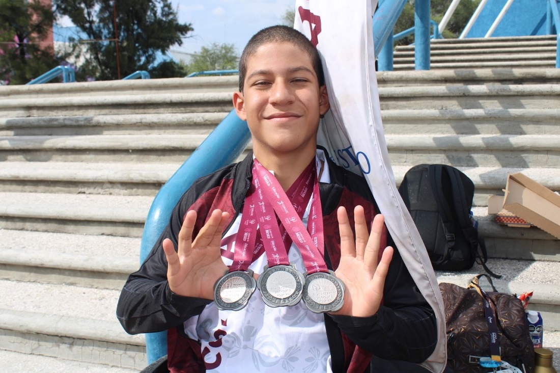 El deportista paralímpico colimense Aquiles Mateo Gómez González cerró su participación en la Paralimpiada Nacional Conade 2025 que se realizó en la alberca olímpica de Aguascalientes, con 2 medallas más de Plata en las pruebas de 50 metros libres y 50 metros mariposa S7 de natación; estas preseas se suman a la obtenida el pasado lunes en 100 metros libres, para 3 medallas en total.