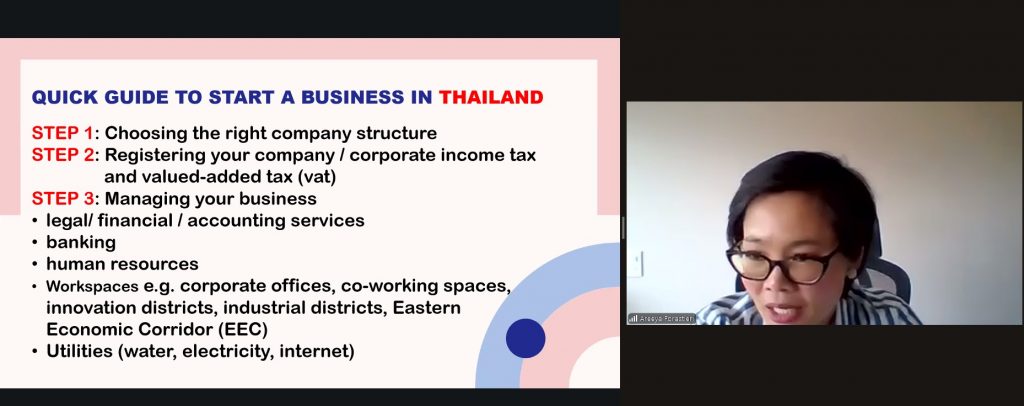 La consejera también presentó una guía práctica para emprendedores interesados en establecer empresas en Tailandia: Elegir la estructura legal adecuada, registrar la compañía y cumplir con los requisitos fiscales, gestionar servicios legales, financieros, bancarios y de recursos humanos, y acceder a espacios de trabajo, corredores económicos e infraestructura con servicios de agua, electricidad e internet a costos competitivos.