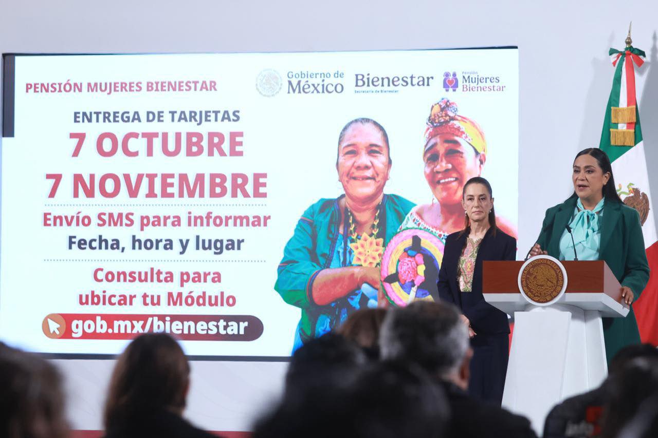 En la conferencia matutina que encabeza la Presidenta de México, Claudia Sheinbaum Pardo, la secretaria de Bienestar, Ariadna Montiel Reyes, informó que, del 7 de octubre al 7 de noviembre, iniciará la entrega de tarjetas de la Pensión Mujeres Bienestar a las mexicanas de 60 a 64 años que se registraron a la pensión.