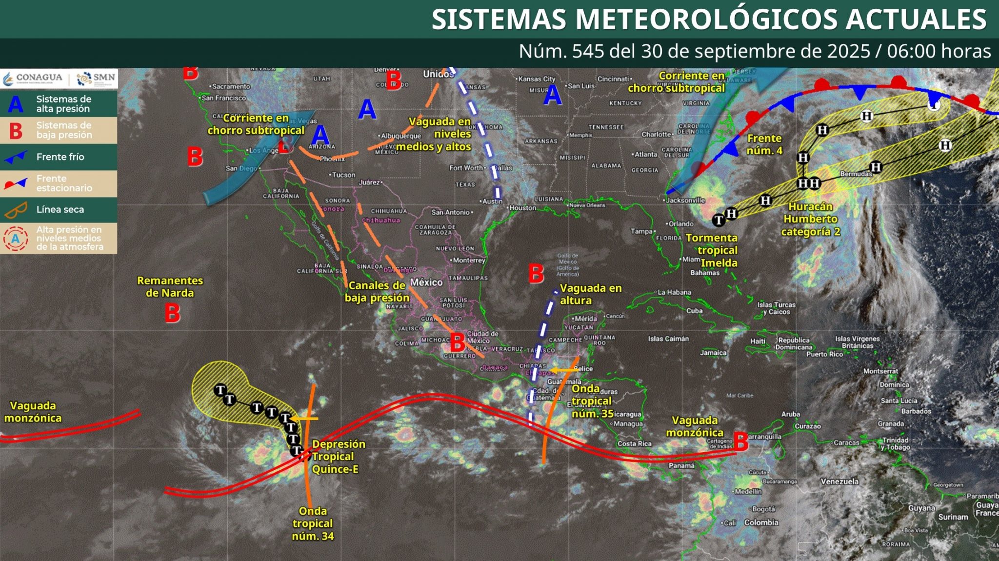 El Servicio Meteorológico Nacional (SMN) informó que para este martes 30 de septiembre se esperan en Colima lluvias puntuales fuertes, acompañadas de descargas eléctricas, así como ambiente cálido a caluroso con temperaturas máximas de hasta 40 °C.