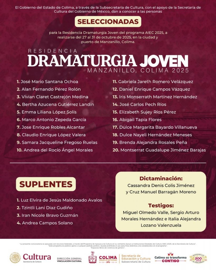 La Subsecretaría de Cultura, en coordinación con la Secretaría de Cultura del Gobierno de México, a través del programa federal de Apoyos a Instituciones Estatales de Cultura, publicó la lista de personas seleccionados para integrar la Residencia en Dramaturgia Joven Manzanillo 2025, que se llevará a cabo del 27 al 31 de octubre del presente año.