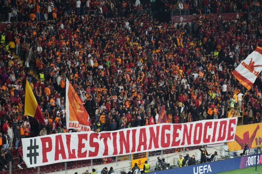 La afición del Galatasaray desplegó 3 pancartas en el partido de Liga de Campeones contra el Liverpool, una con la frase “Palestina Libre”, otra con “Gaza libre y bebés vivos” y una tercera en la que podía leerse “Si Jerusalén no es libre, el Mundo es cautivo”.
