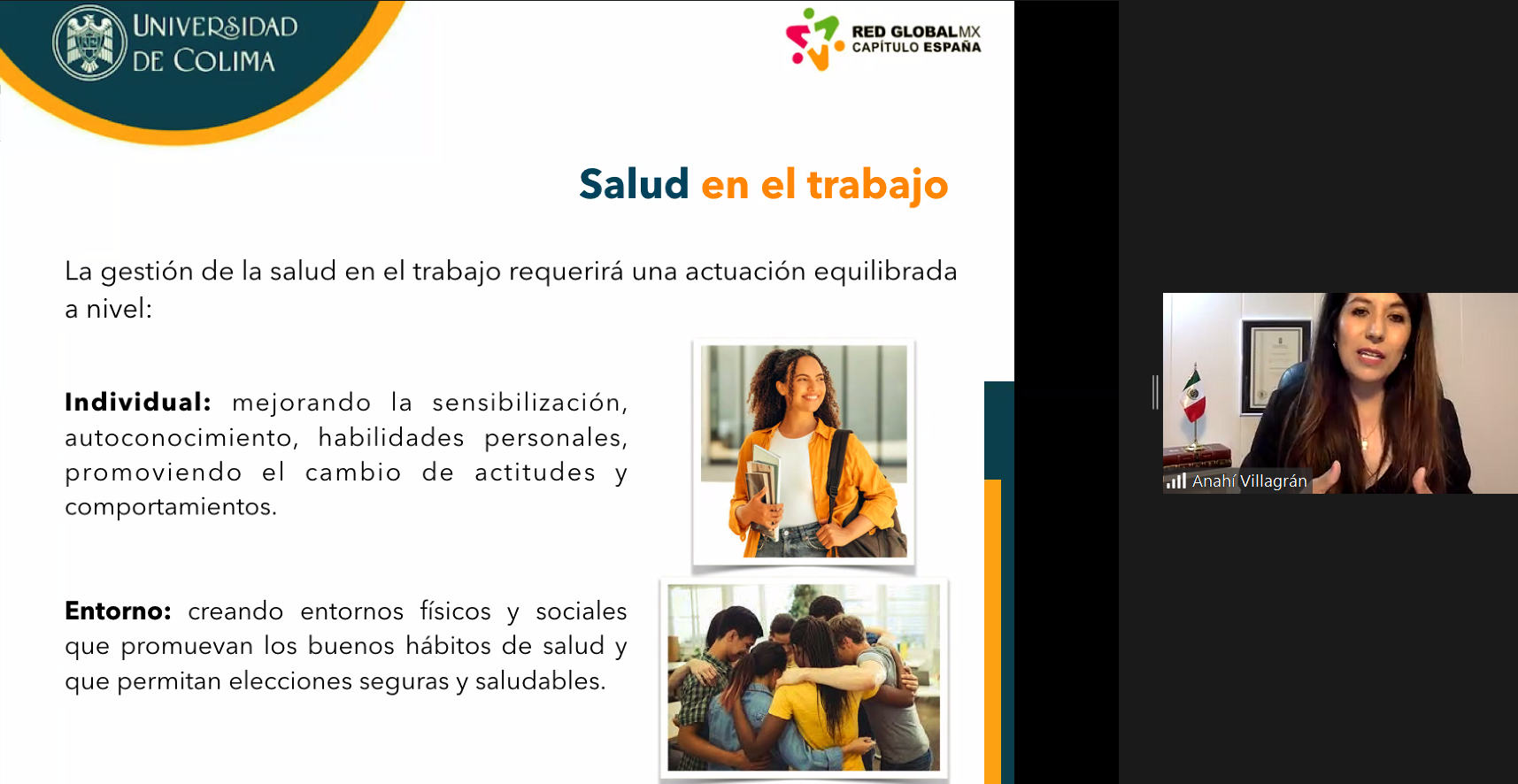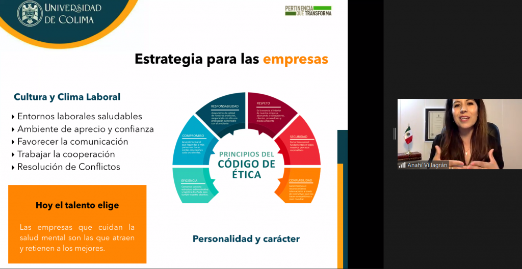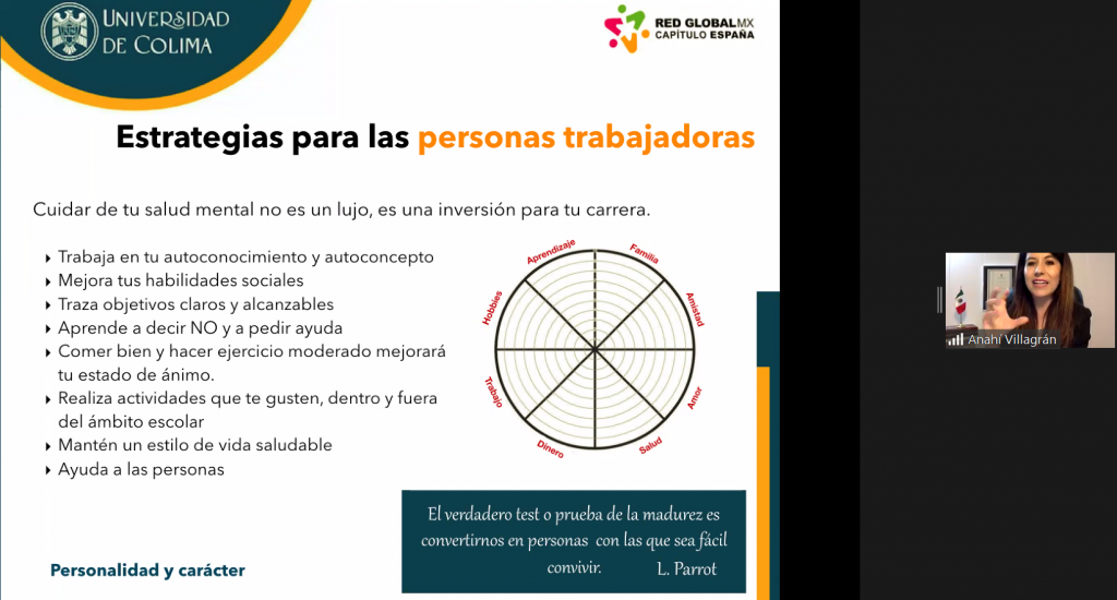Ella dictó la charla virtual titulada “Bienestar laboral: importancia de la salud mental en el trabajo”, como parte del Programa de Transferencia de Conocimientos de la Red Global MX Capítulo España y la Universidad de Colima. En esta ocasión, la charla estuvo dirigida a estudiantes y profesores de la Facultad de Turismo y la Facultad de Turismo y Gastronomía.