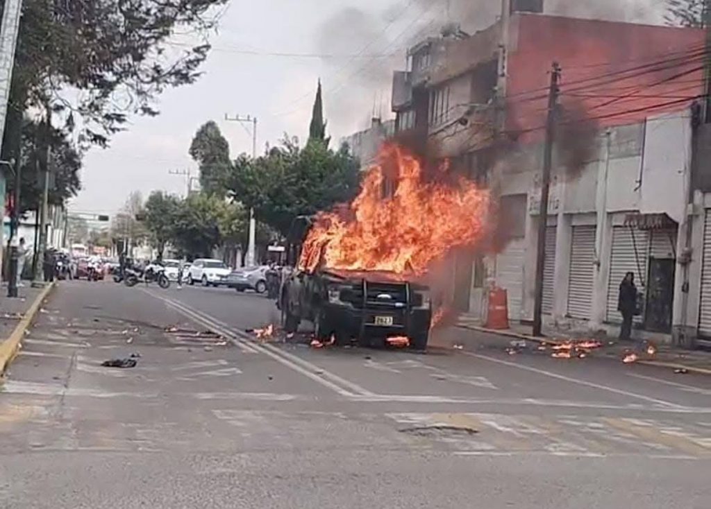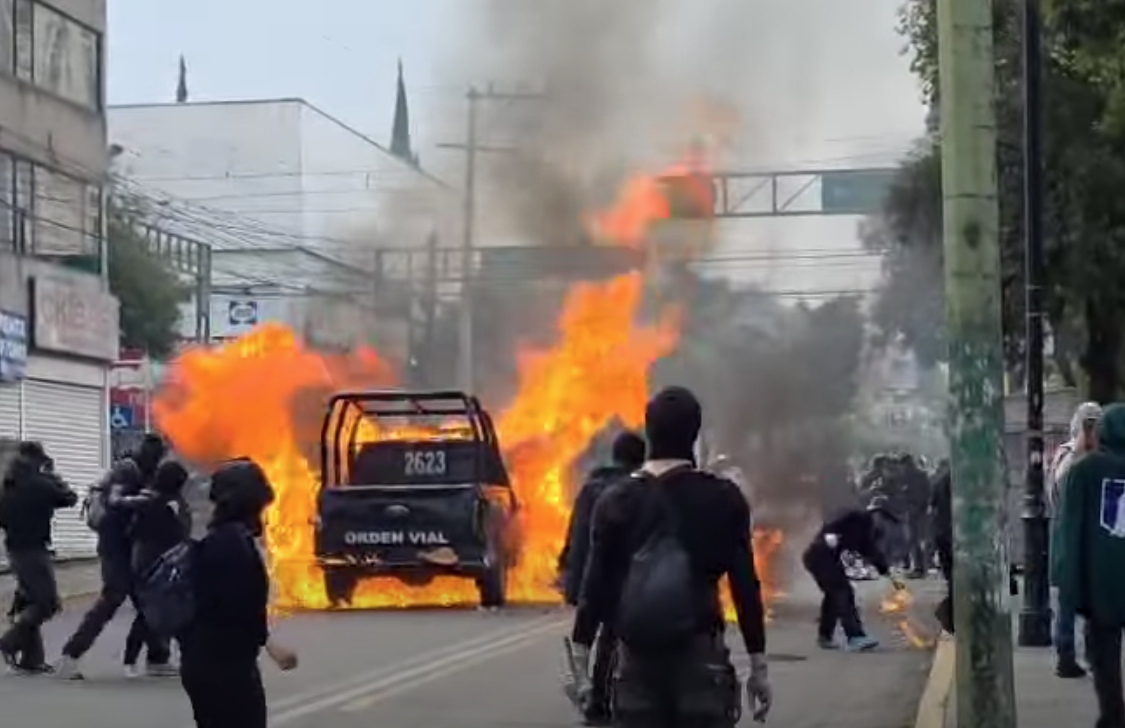 Horas después de que se registrara un enfrentamiento a golpes entre estudiantes y policías durante la marcha del 2 de Octubre en Toluca, un grupo de jóvenes quemó una patrulla, por lo que al menos 5 de ellos fueron detenidos.