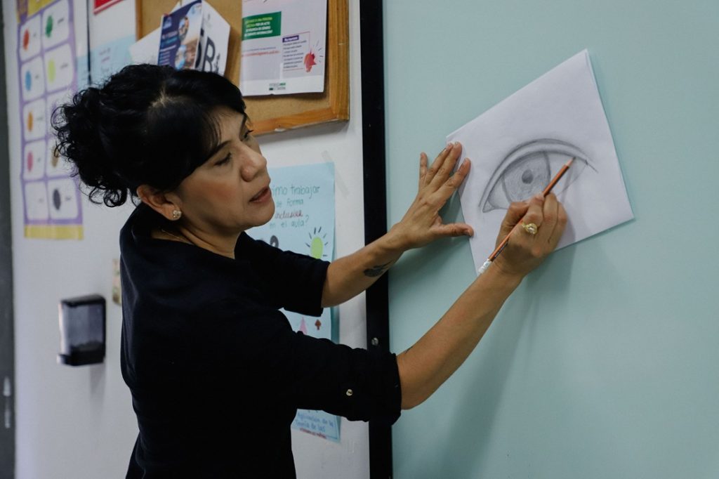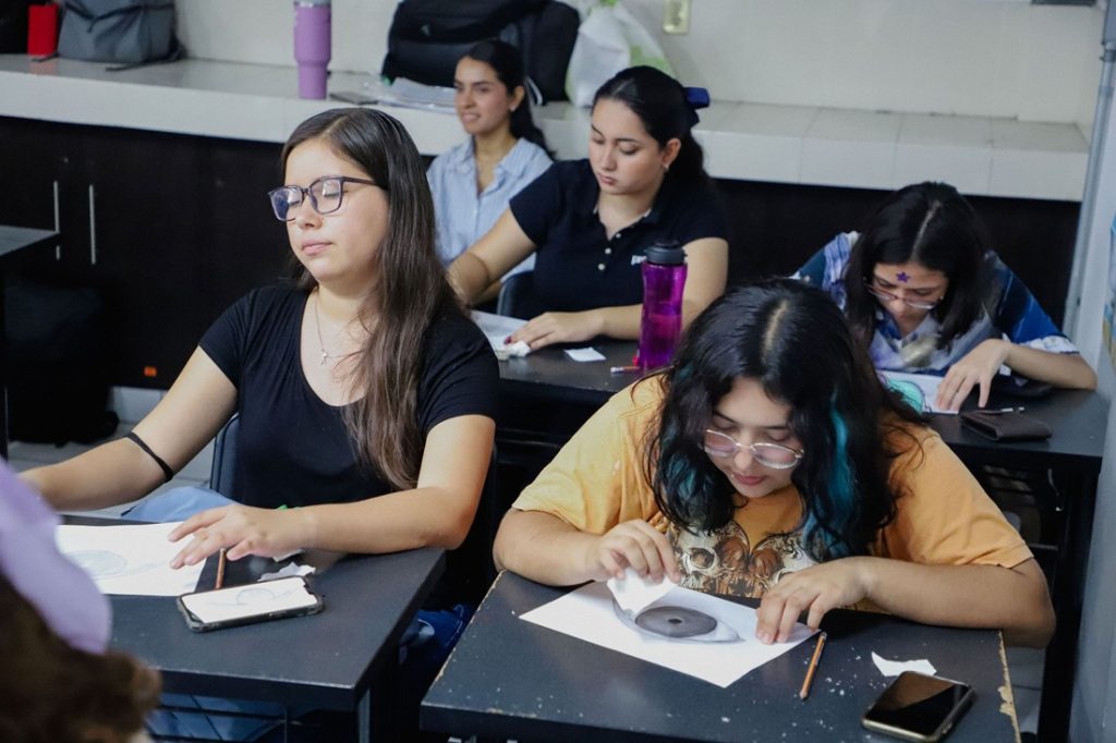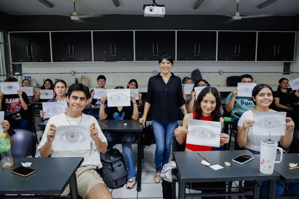 Durante la sesión, las y los estudiantes practicaron la elaboración de un ojo humano, añadiendo detalles y proporciones bajo la guía experta de la docente, lo que les permitió un acercamiento práctico a los principios del retrato.