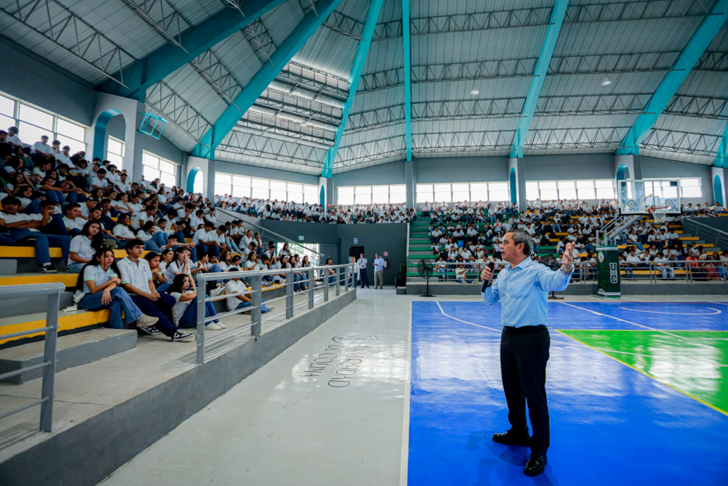 El Rector inició su intervención interactuando con los estudiantes presentes en el polideportivo, preguntando quiénes tenían algún problema por resolver y levantando él mismo la mano para ejemplificar que todos enfrentamos dificultades. Destacó que la única opción viable ante los problemas es enfrentarlos, identificarlos y atenderlos, en lugar de ignorarlos y permitir que crezcan. Recomendó abordar un problema a la vez para evitar el agotamiento y el estrés.