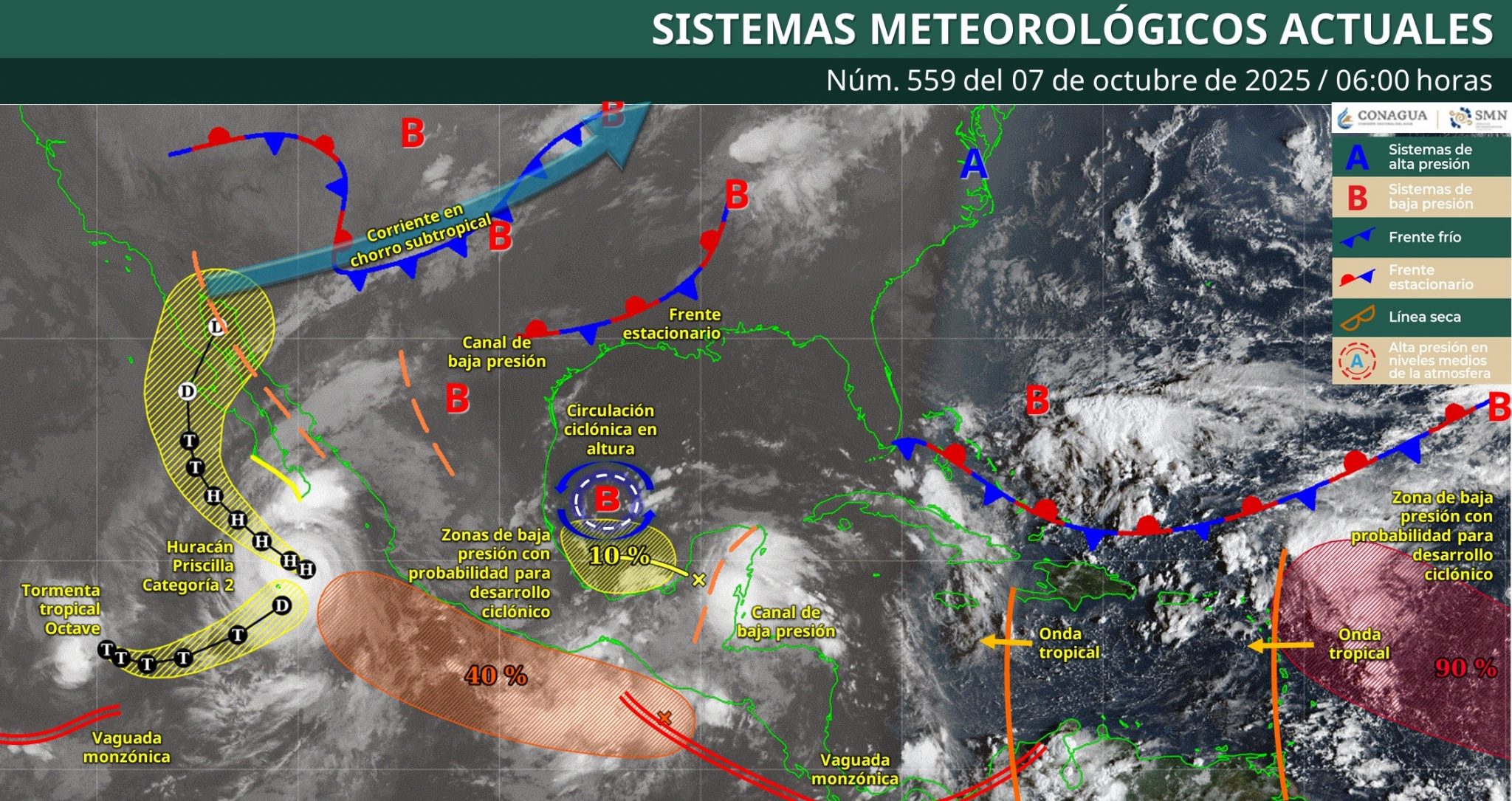 En cuanto a las condiciones térmicas, el SMN pronostica temperaturas máximas de 30 a 35 °C durante la tarde de este martes 7 de octubre, con un ambiente caluroso en zonas de valle y costa, y templado por la mañana en regiones altas del estado.