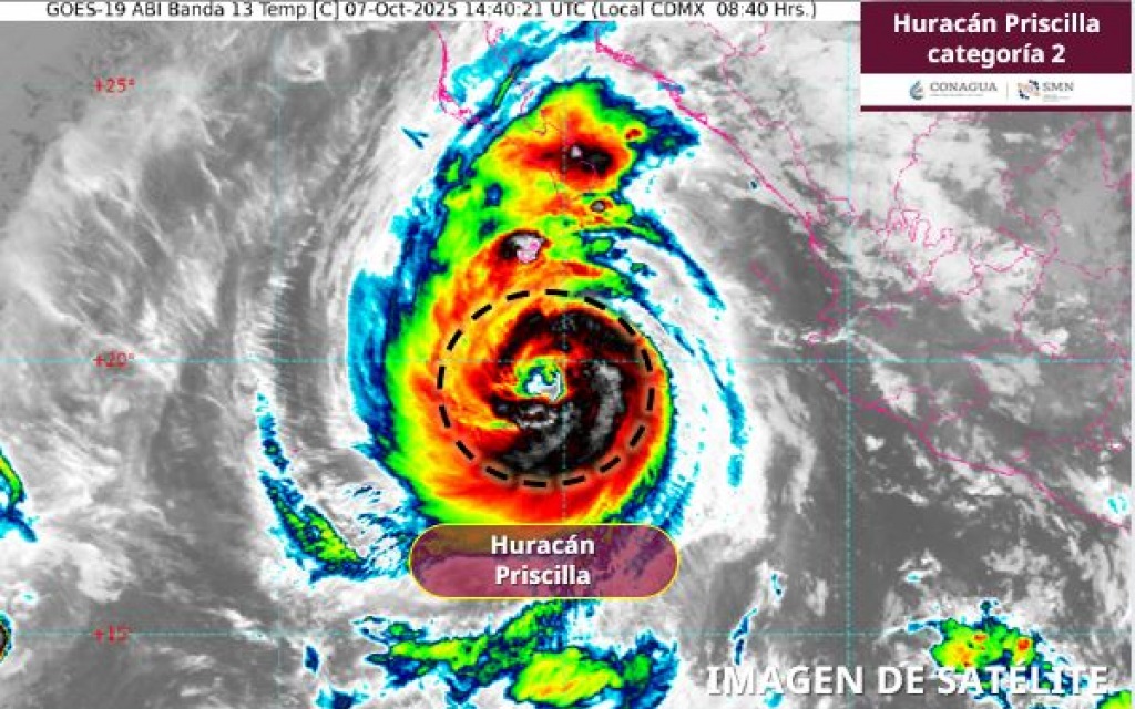 El huracán Priscilla, de categoría 2 en la escala Saffir-Simpson, continúa desplazándose lentamente hacia el noroeste sobre aguas del océano Pacífico, manteniendo su influencia sobre el occidente del país y generando condiciones de inestabilidad, con lluvias intensas, rachas fuertes de viento y oleaje elevado en las costas del Pacífico mexicano, principalmente en Baja California Sur, Sinaloa, Nayarit, Jalisco, Colima y Michoacán, informó el Servicio Meteorológico Nacional (SMN).