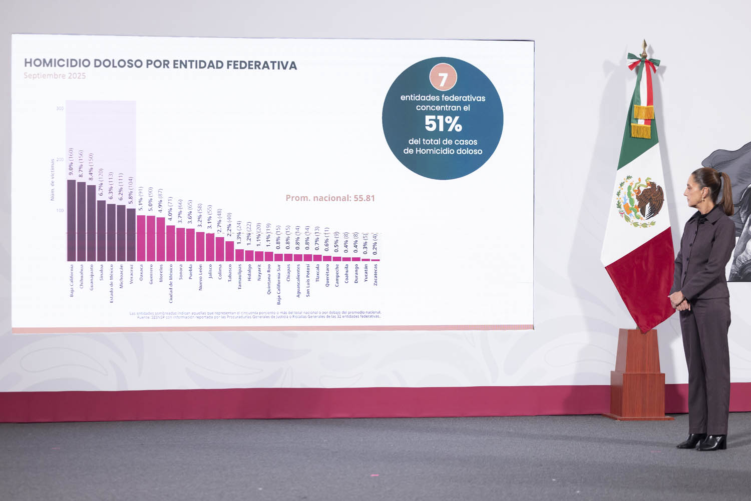 La funcionaria, además, informó que este septiembre de 2025 fue el más bajo registrado desde el mismo mes en 2016 de homicidio doloso.