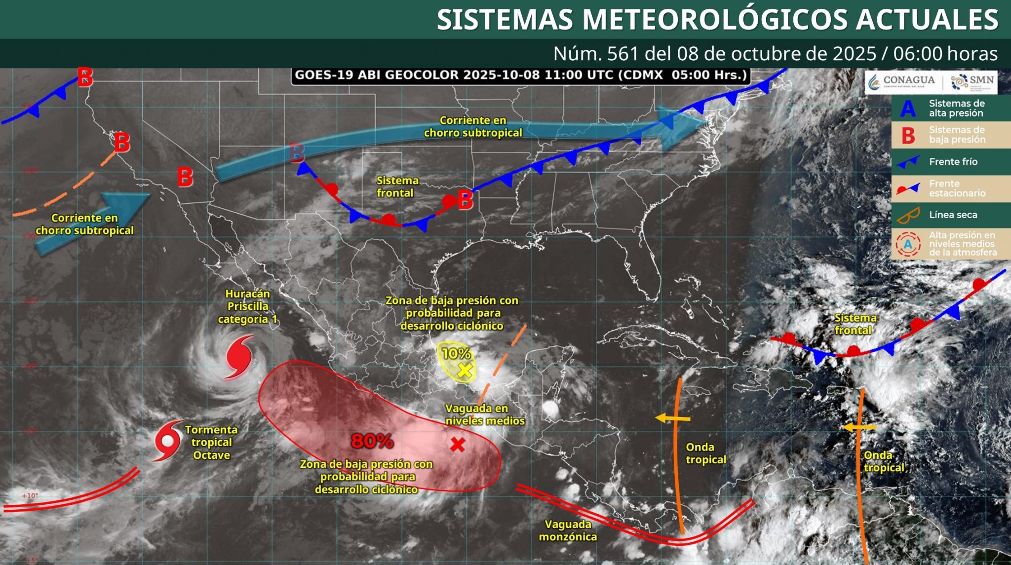 El huracán Priscilla, que este miércoles 8 de octubre se desplazará frente a la costa oeste de Baja California Sur, continuará influyendo en las condiciones meteorológicas del Pacífico mexicano, generando lluvias y oleaje elevado en diversos estados, entre ellos Colima.