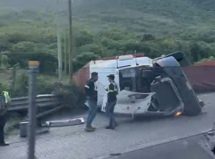 De acuerdo con el parte oficial, un tráiler de doble contenedor sufrió un percance sobre la vía, quedando atravesado en el carril de baja velocidad, mientras parte de su carga se dispersó a un costado de la carretera, lo que ha afectado la circulación vehicular en ese tramo de la autopista Manzanillo-Colima.