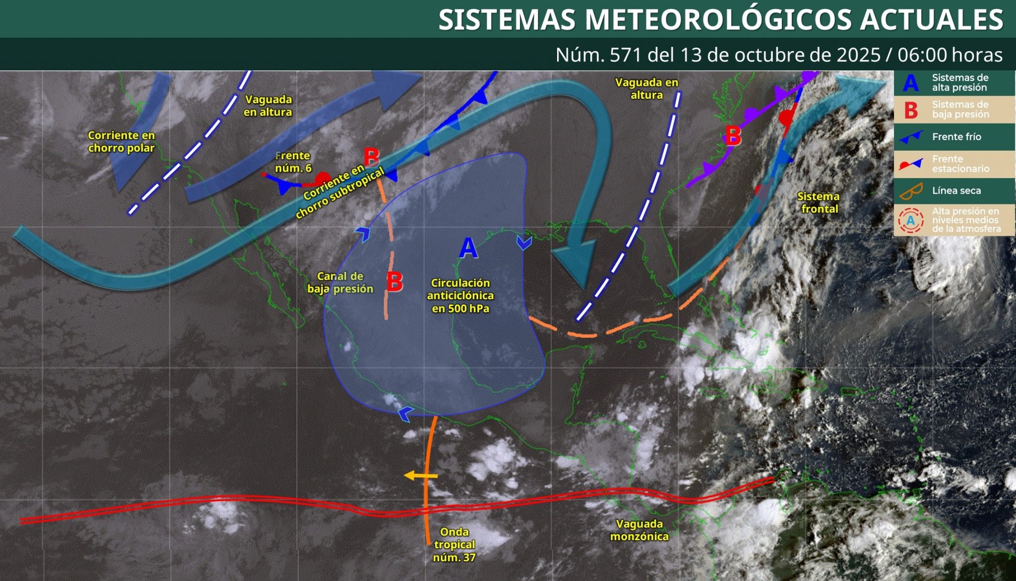 Esas condiciones se deben a la presencia de varios sistemas meteorológicos que influyen sobre el occidente del país, entre ellos canales de baja presión, una vaguada en altura, así como el arrastre de humedad proveniente de la vaguada monzónica que se extiende frente a las costas del Pacífico sur.
