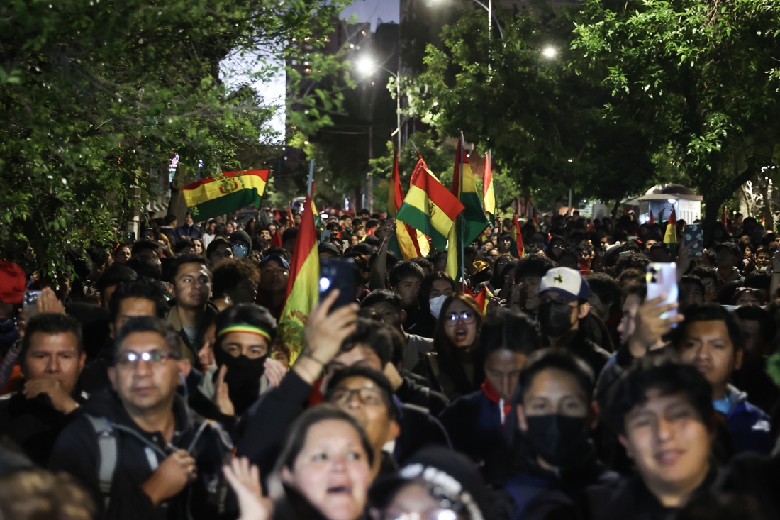 Decenas de personas, mayormente jóvenes, llegaron en marcha hasta la sede del Tribunal Supremo Electoral (TSE) en La Paz con banderas de Bolivia gritando consignas contra un supuesto “fraude” y para exigir “una auditoría a las elecciones”, según dijo a los medios uno de los manifestantes, Conrad Arana.