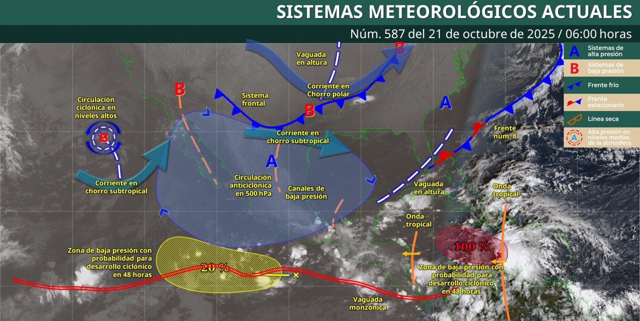 A nivel nacional, el organismo reportó que otro canal de baja presión y una zona con probabilidad para desarrollo ciclónico al sur de las costas de Guerrero reforzarán las lluvias en el sur del país, mientras que un nuevo frente frío se aproxima a la frontera norte generando rachas de viento de hasta 60 km/h.