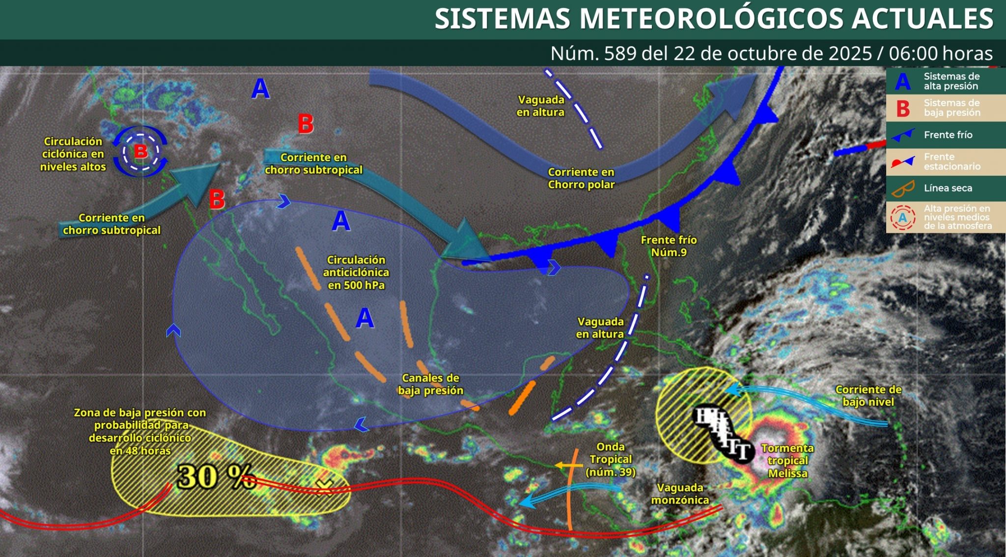 Este miércoles 22 de octubre, el Servicio Meteorológico Nacional (SMN) pronostica para el estado de Colima intervalos de chubascos con acumulaciones de 5 a 25 milímetros, principalmente en las regiones costeras y del sur de la entidad, como resultado de la combinación de un canal de baja presión sobre el interior del país y el ingreso de humedad proveniente del océano Pacífico.