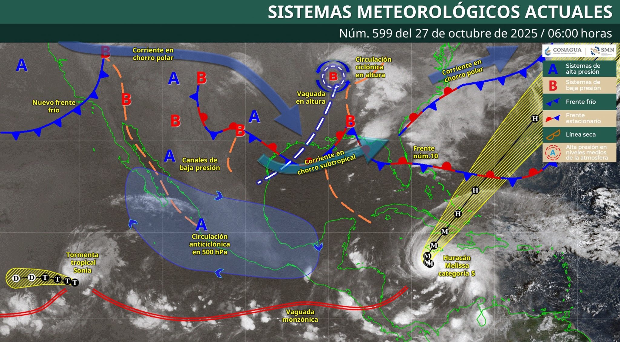 En el caso particular de Colima, se estiman intervalos de chubascos con acumulaciones de 5 a 25 milímetros, sin descartar actividad eléctrica en algunas zonas de la costa y la zona montañosa. Durante la mañana el ambiente será templado, mientras que por la tarde se espera temperatura máxima entre los 30 y 35 °C, con sensación térmica superior en áreas urbanas y costeras.