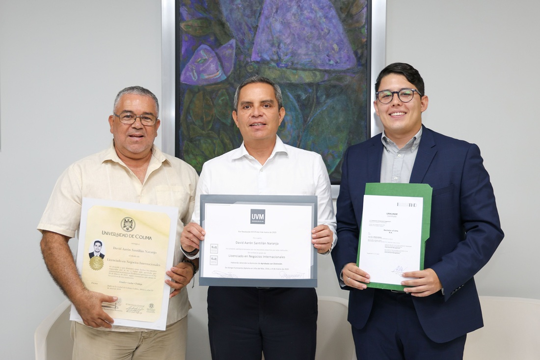 En el Salón de Protocolo de Rectoría, Christian Jorge Torres Ortiz Zermeño, Rector de la Universidad de Colima (UdeC), entregó 2 títulos de Doble Grado a Honorio Santillán en nombre de su hijo, David Aaron Santillán Naranjo, y a Ricardo Adrián Servín Llanes, ambos egresados de la carrera de Negocios Internacionales de la Facultad de Economía y egresados también de la Universidad de Viña del Mar en Chile y del Deggendorf Institute of Technology en Alemania, respectivamente.