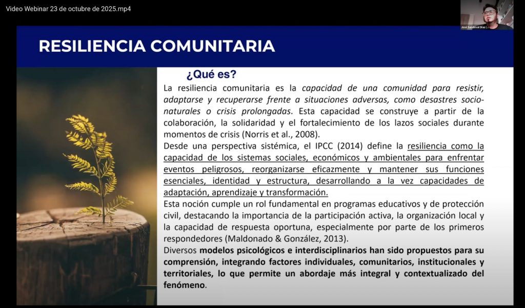 Como parte del programa conmemorativo, se impartió el webinar “Co-construcción de la resiliencia comunitaria frente al riesgo de desastres a través de metodologías participativas”, a cargo del Doctor José Sandoval Díaz, director del Centro de Estudios Ñuble de la Universidad del Biobío, en Chile.