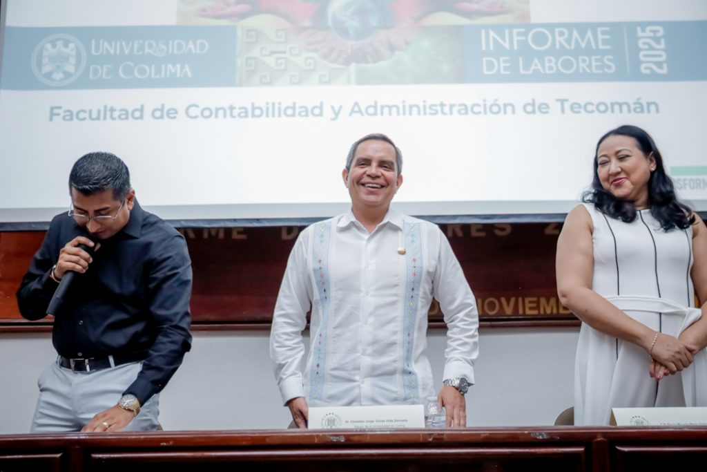 La Facultad de Contabilidad y Administración de Tecomán (FCAT) de la Universidad de Colima presentó su Informe de Labores 2025, en una ceremonia que encabezó el Rector Christian Jorge Torres Ortiz Zermeño, en el auditorio principal del Centro de Tecnología Educativa del Campus La Estación.