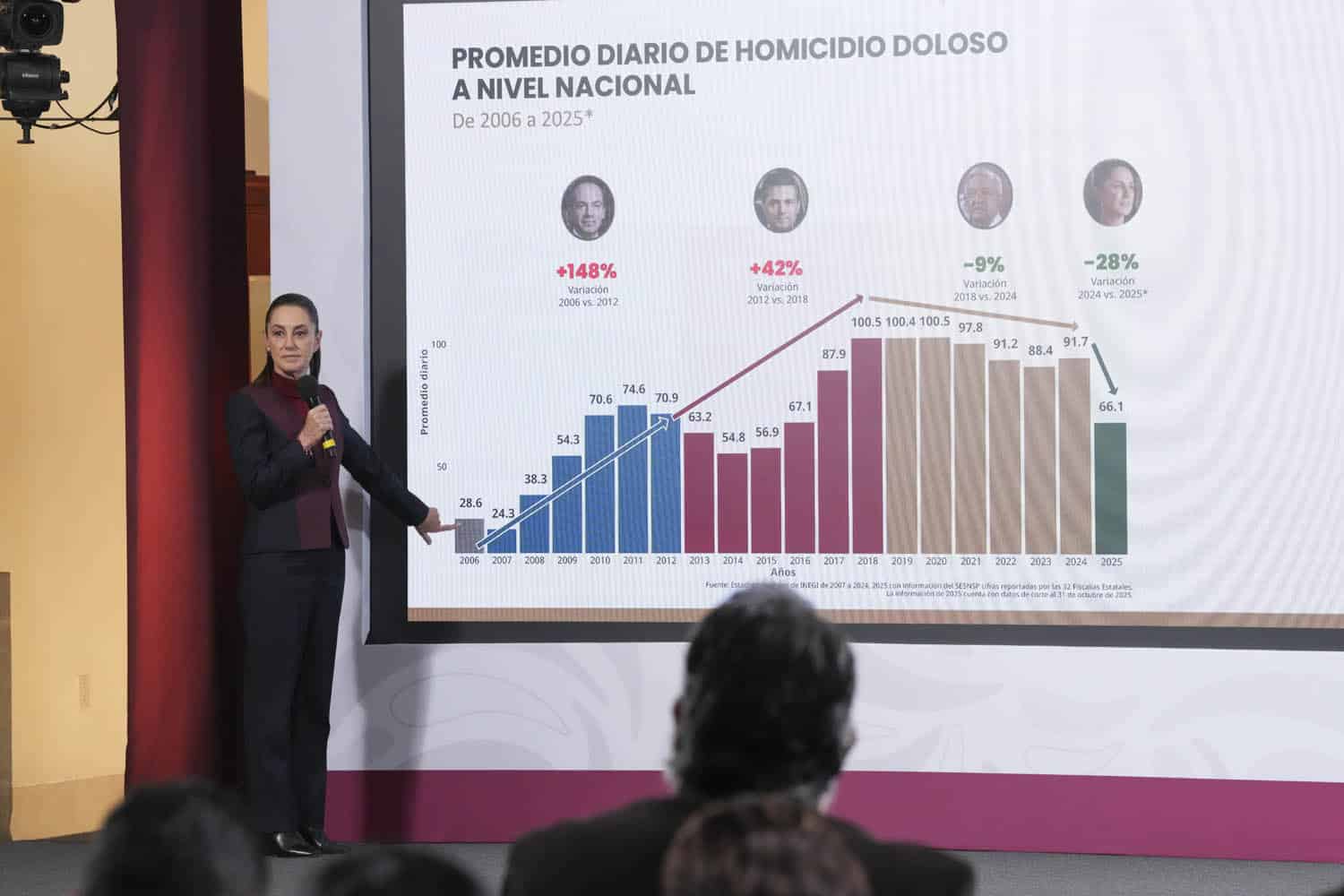 De acuerdo con un comunicado de prensa, la mandataria destacó que, de 2006, último año de Vicente Fox, al 2012, último de Felipe Calderón, los homicidios dolosos aumentaron en 148%, como resultado de la llamada “guerra contra el narco” y de igual forma, del último año de Calderón al último de Enrique Peña Nieto, incrementaron en 42%. Mientras que, del último año de Peña al último del expresidente Andrés Manuel López Obrador en 2024, la reducción en este delito fue de 9%. Y al 31 de octubre de 2025, la disminución es del 28%. Por ello, puntualizó, con la Cuarta Transformación cambió la estrategia y se están dando resultados.