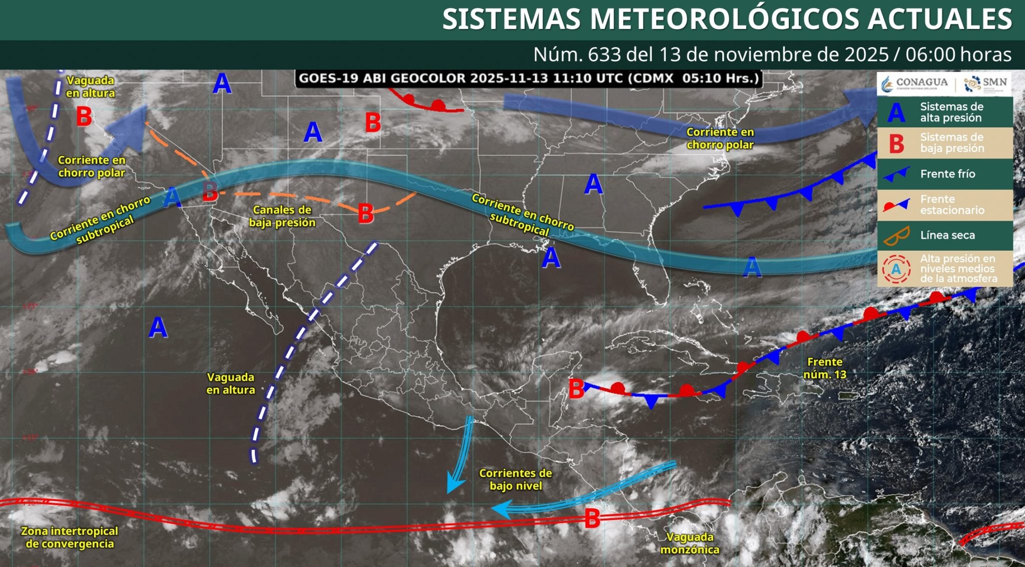 Por la noche, un nuevo frente frío se aproximará al noroeste del territorio nacional. Su interacción con una vaguada polar y las corrientes en chorro polar y subtropical generará fuertes rachas de viento y lluvias aisladas en Baja California.