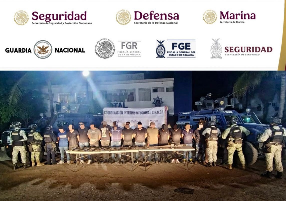 Mientras en Navolato, también en Sinaloa, tras recibir una denuncia ciudadana, donde reportaban la presencia de personas armadas en un hotel de la localidad, los “agentes del Gabinete de Seguridad, en coordinación con la Secretaría de Seguridad Pública y Fiscalía General del estado, detuvieron a 14 personas, tres de ellas extranjeras, se aseguraron 13 armas largas y una ametralladora”, precisó la SSPC.