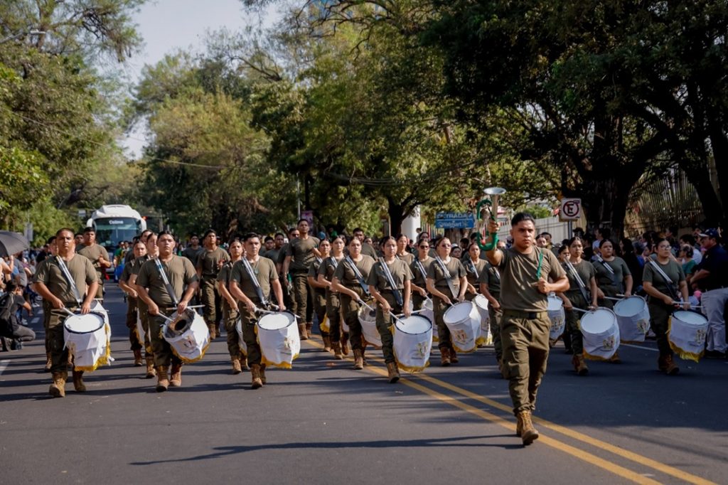 La escolta de Bandera del Bachillerato 4, con sus 47 años de trayectoria, marchó con paso firme, seguida por la Banda de Guerra Monumental, integrada por alumnos de 6 planteles de bachillerato, cuyo ritmo y cadencia marcaron el corazón del contingente.